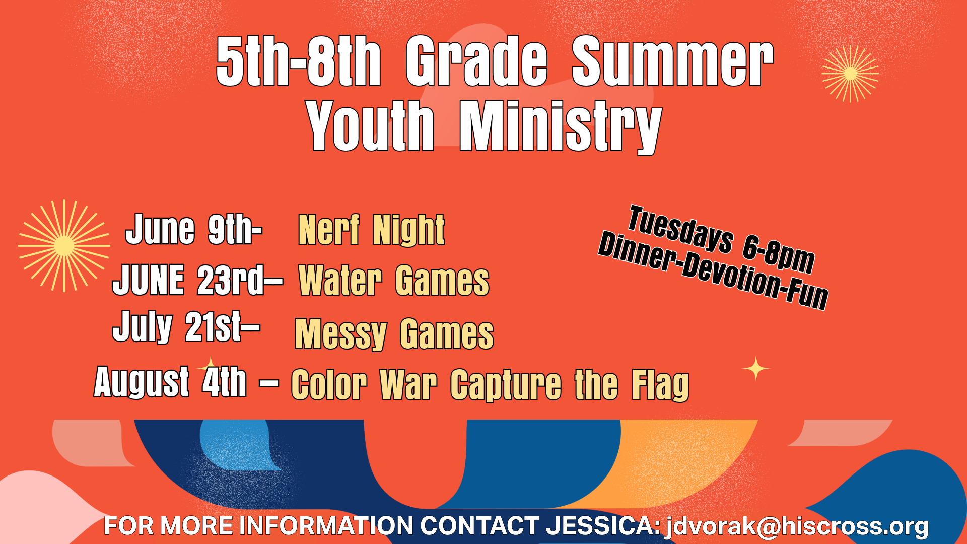 For questions or other information, please contact our Youth Ministry Coordinator, Jessica Dvorak by email at jdvorak@hiscross.org